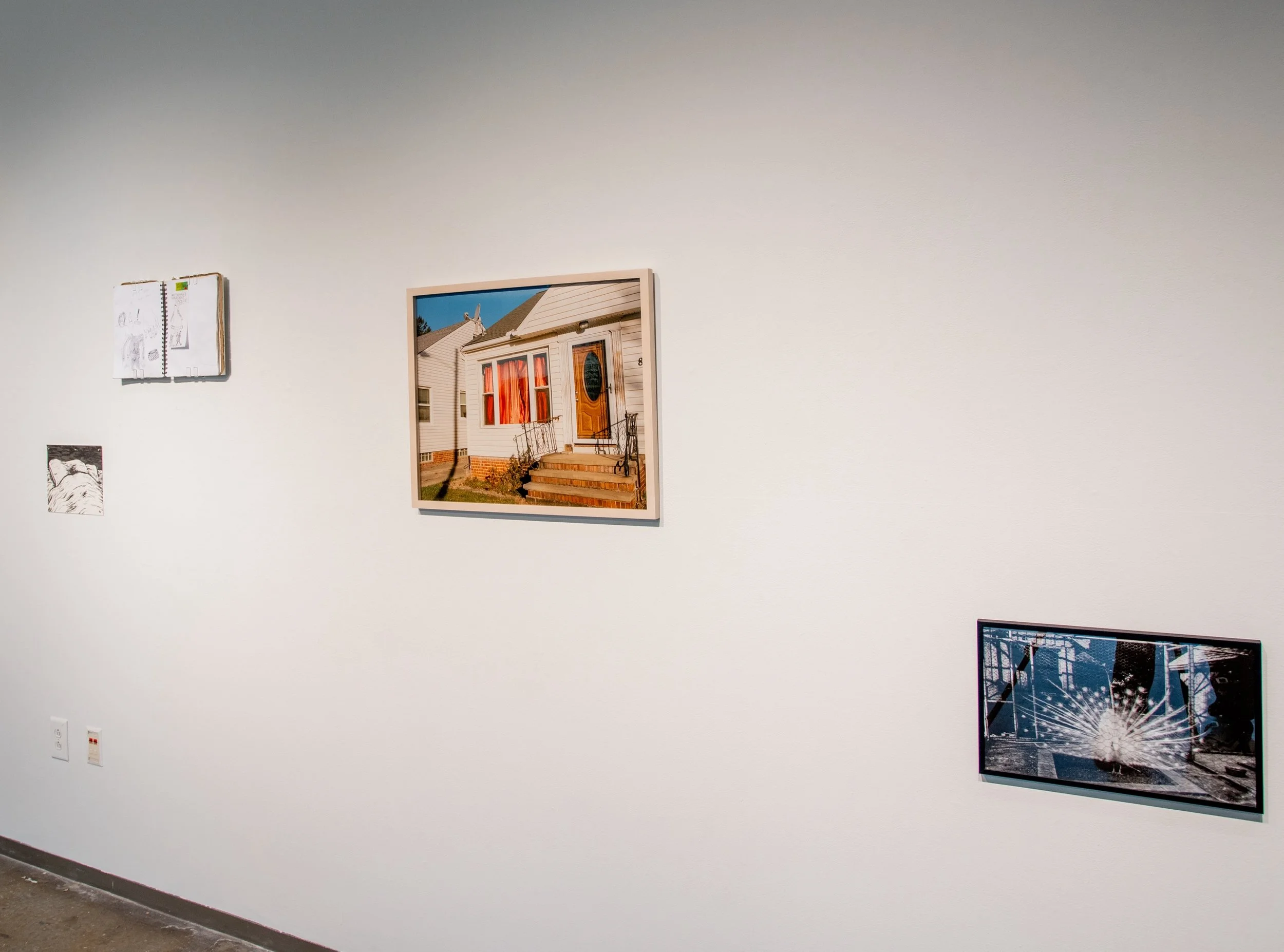 This imagining emerges also in Sarah LaPonte’s recent zines, The Color of Lightning and The Right to Disappear, through the intersection of superstition and natural phenomena. Her constellation of personal narrative and source texts ill”ustrate how we reach for structures that order our experiences of luck and loss. The publications complement LaPonte’s photographic practice, which infuses magical thinking into mundane moments. Her world is dirty floors and open skies, shared meals and walls down to the studs. Dylan Lewis’s images also carry this haunted mundanity of places apart. Empty of inhabitants yet charged with the leftover spell of presence, Lewis’s photographs construct fictions using “the emotional texture of dreams within an always-already fractured reality.” The series Junebug vs. Hurricane uses the disappearance of folk musician Connie Converse to think about the downfall of fantasy as a reckoning point. Lush red curtains promise a version of luxury quickly fading. When a dream fails, what story is left?